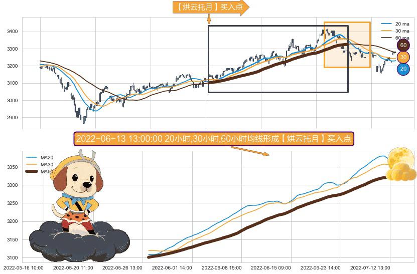 ⚀ 2022-05-27 09:00:00小时-2022-07-13 14:00:00小时显现 20小时-30小时-60小时均线 【烘云托月】买入点 看多信号,后市看涨,买入