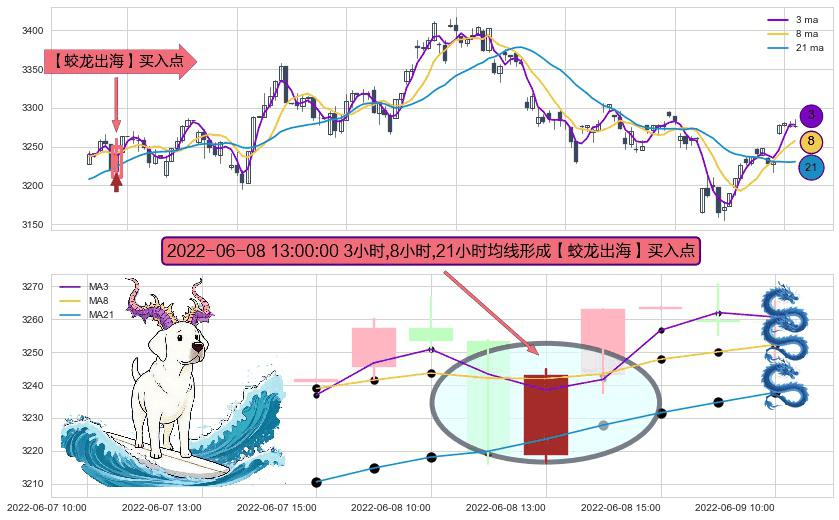 ⚀ 2022-06-08 13:00:00小时显现 3小时-8小时-21小时均线 【蛟龙出海】买入点 看多信号,后市看涨,买入