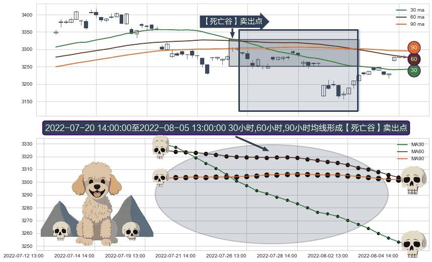 ⚀ 2022-07-21 13:00:00-小时至2022-08-05 13:00:00-小时显现 30小时-60小时-90小时均线 【死亡谷】卖出点 看空信号,后市看跌,卖出