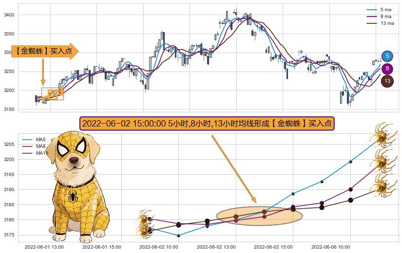⚀ 2022-06-02 15:00:00小时显现 5小时-8小时-13小时均线 【金蜘蛛】买入点 看多信号,后市看涨,买入
