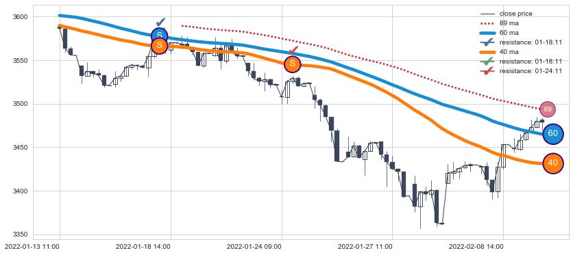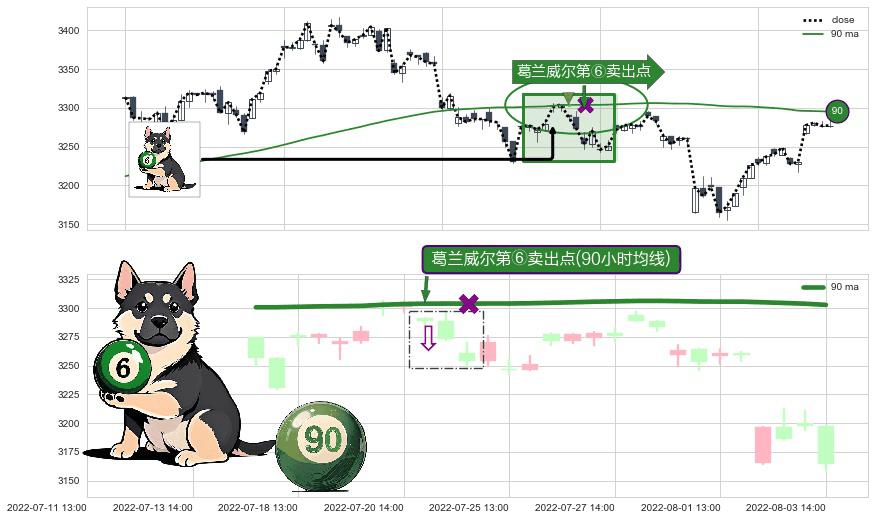 ⚀ 2022-07-21 13:00:00-小时显现 葛兰威尔均线 90小时均线 第⑥卖出点 走势反转见顶信号,后市看跌,卖出信号