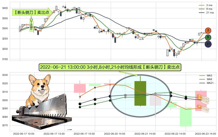 ⚀ 2022-06-21 13:00:00小时显现 3小时-8小时-21小时均线 【断头铡刀】卖出点 看空信号,后市看跌,卖出