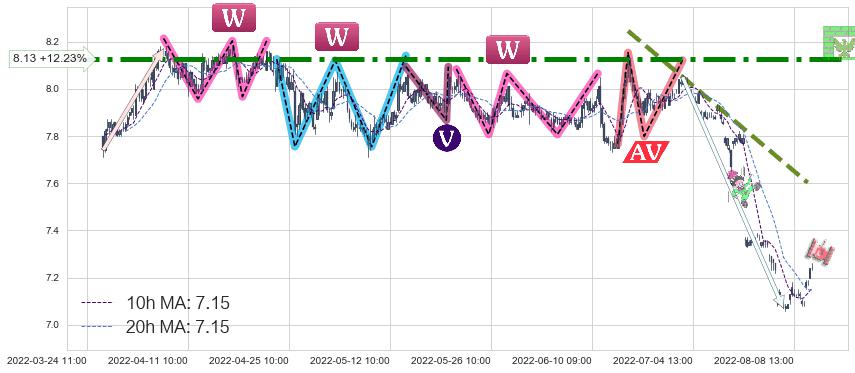 2022-06-15: 第一阻力位8.13强力阻拦了上升趋势,成功阻止了价格的继续上涨。