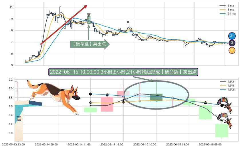 形态多维评估: ⚀ 2022-06-15 10:00:00小时显现 3小时-8小时-21小时均线 【绝命跳】卖出点 看空信号,后市看跌,卖出