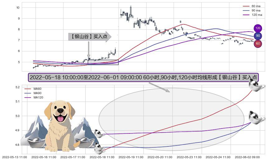 形态多维评估: ⚀ 2022-05-18 11:00:00-小时至2022-06-01 09:00:00-小时显现 60小时-90小时-120小时均线 【银山谷】买入点 看多信号,后市看涨,买入