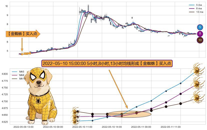 形态多维评估: ⚀ 2022-05-10 15:00:00小时显现 5小时-8小时-13小时均线 【金蜘蛛】买入点 看多信号,后市看涨,买入