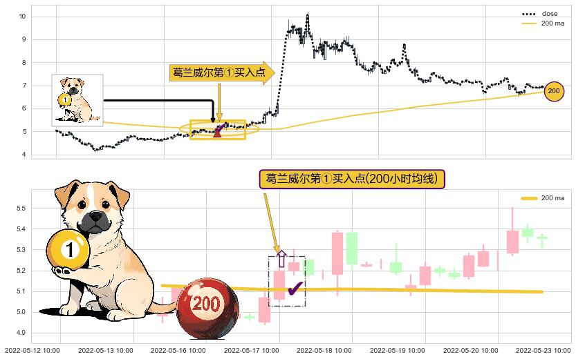 形态多维评估: ⚀ 2022-05-17 10:00:00-小时显现 葛兰威尔均线 200小时均线 第买①入点 走势反转见底信号,后市看涨,买进信号