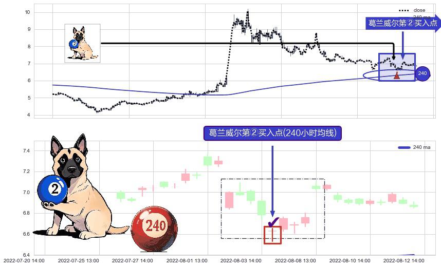形态多维评估: ⚀ 2022-08-04 13:00:00-小时显现 葛兰威尔均线 240小时均线 第②买入点 上升趋势的中继信号,后市看涨,买进信号