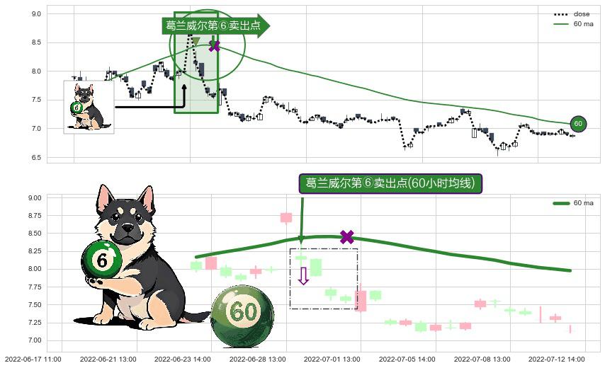 形态多维评估: ⚀ 2022-06-29 13:00:00-小时显现 葛兰威尔均线 60小时均线 第⑥卖出点 走势反转见顶信号,后市看跌,卖出信号