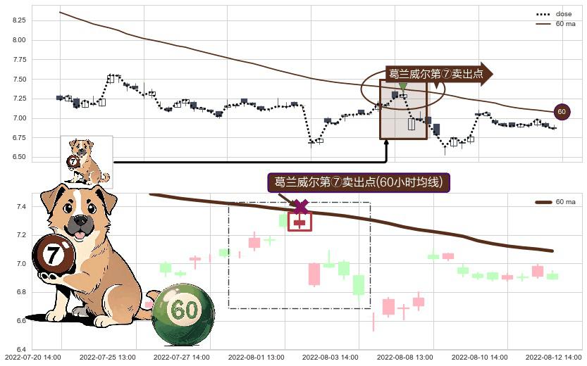 形态多维评估: ⚀ 2022-08-01 14:00:00-小时显现 葛兰威尔均线 60小时均线 第⑦卖出点 下降趋势的中继信号,后市看跌,卖出信号