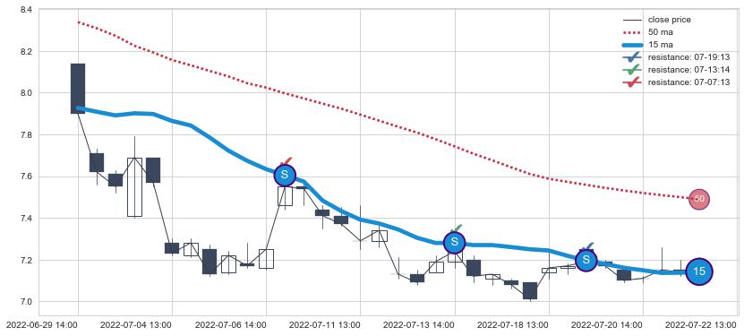 下跌趋势06-29 14:00-07-22 13:00,均线15确认关键阻力3处