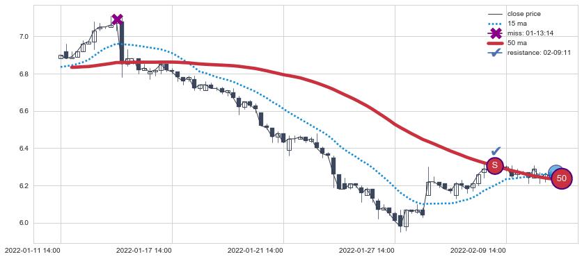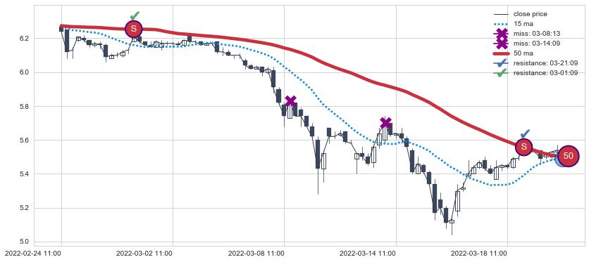 下跌趋势02-24 11:00-03-22 10:00,均线50确认关键阻力2处