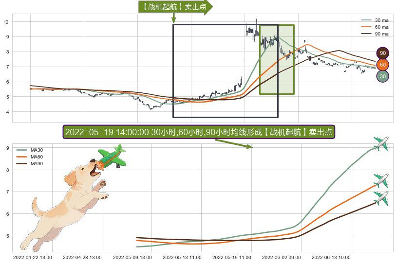 形态多维评估: ⚀ 2022-05-06 11:00:00小时-2022-06-15 10:00:00小时显现 30小时-60小时-90小时均线 【战机起航】卖出点 看空信号,后市看跌,卖出