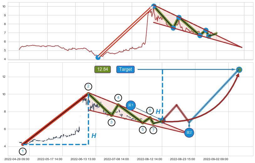 ➢ 最小中继整理涨幅→𝐇: 5.86 (𝐇楔型旗杆的长度:楔型起点→顶点)