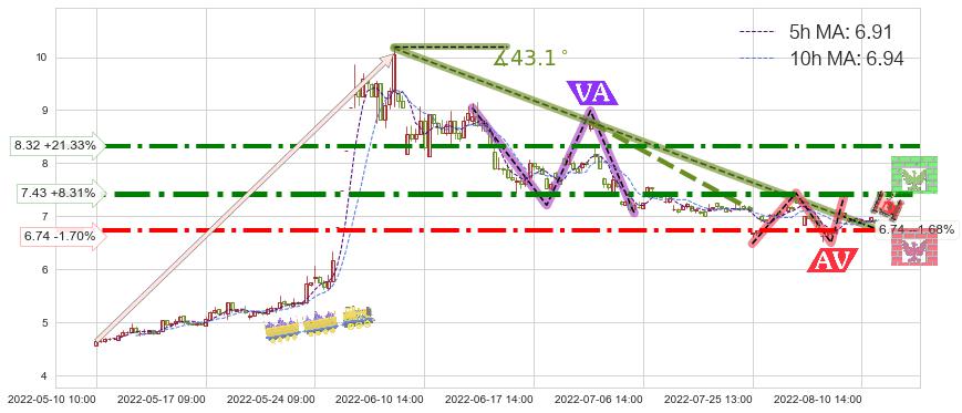 ♘ 在最后的下跌阶段2022-06-08 14:00至2022-08-08 13:00,存在 破位边缘的阻力位 ,阻力价格6.74,可信任强度75.36%,其距离最后价格6.86相差 -1.68%