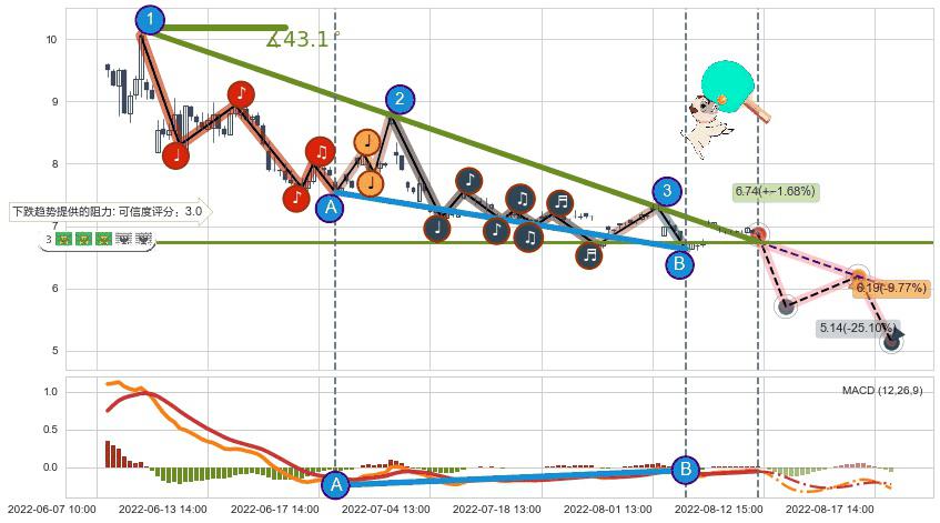 ➣ 预测:2022-08-17 11:00,【试探阻力】稳定目前下跌趋势的前提下,预测价格:6.19
