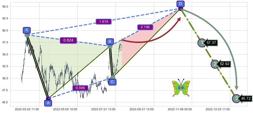 ➣ D点拟合预测价格64.57,距离最后交易收盘价格58.00相差 +11.33%
