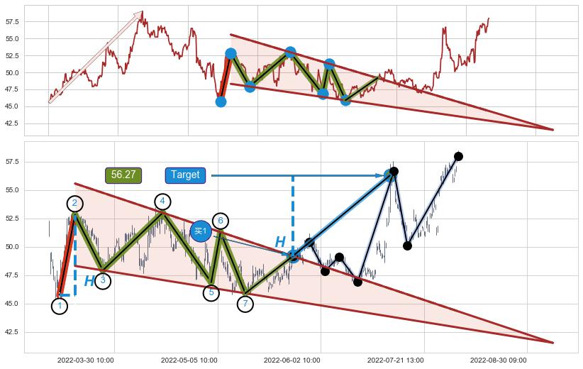 ➢ 最小中继整理涨幅→𝐇: 7.10 (𝐇楔型旗杆的长度:楔型起点→顶点)
