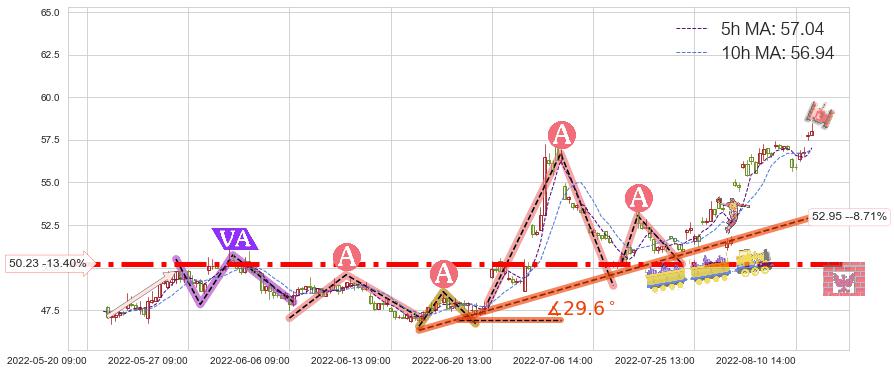 ♘ 在最后的上升阶段2022-06-14 11:00至2022-08-12 14:00存在 持续未破位的支撑位 ,支撑价格52.95,支撑可信任强度80.33%,其距离最后价格58.00相差 -8.71%