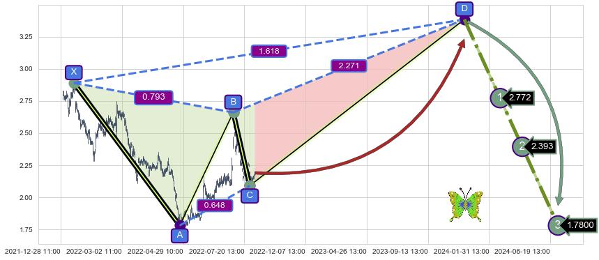 ➣ D点拟合预测价格3.384,距离最后交易收盘价格2.190相差 +54.54%