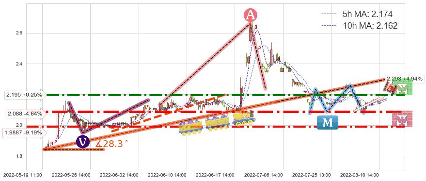 ♘ 阻力价格位2.195,可信任强度74.14%,距离最后交易2022-08-12 14:00形成的收盘价格2.190相差 +0.25%