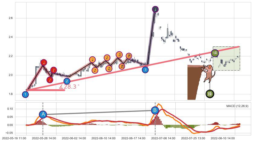 从2022-08-02 13:00至2022-08-12 14:00,共包含18个小时,阶段股价上涨4.76%,阶段股价变动位移路程比: 1 : 2