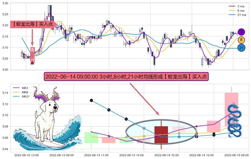 形态多维评估: ⚀ 2022-06-14 09:00:00小时显现 3小时-8小时-21小时均线 【蛟龙出海】买入点 看多信号,后市看涨,买入
