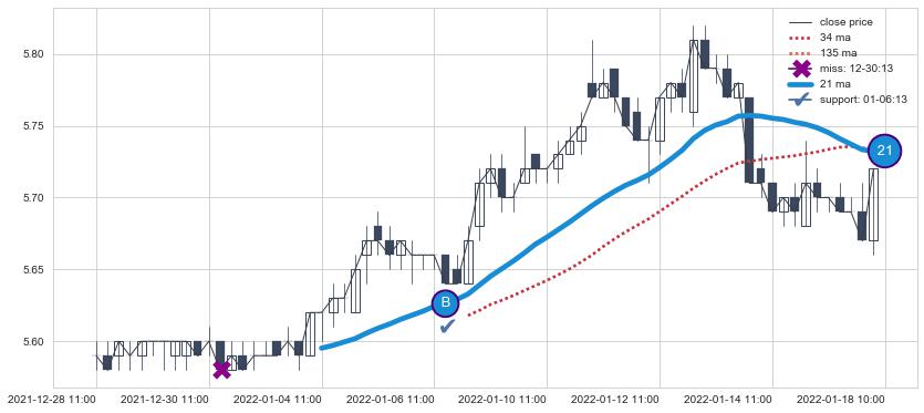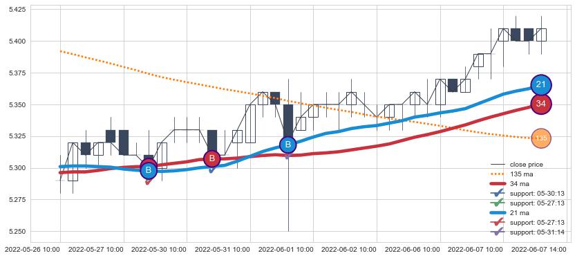 上涨趋势05-26 10:00-06-07 14:00,均线34, 21确认关键支撑3处