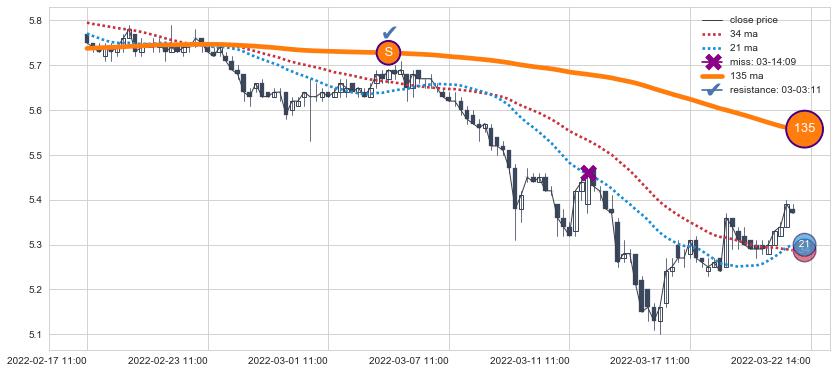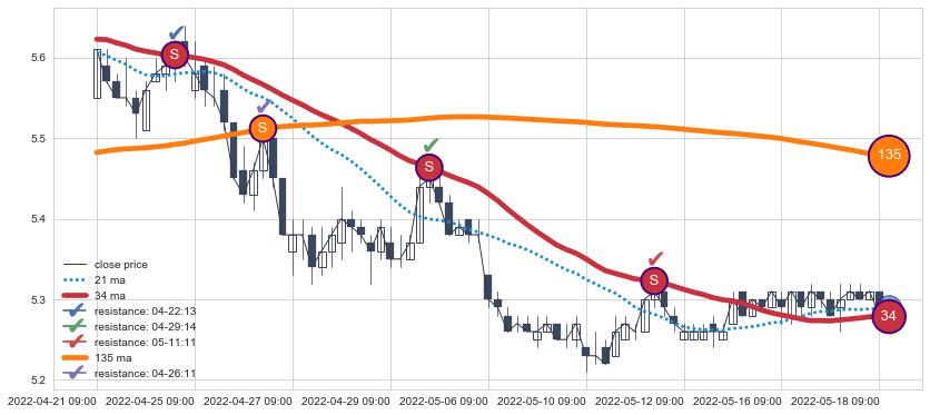 下跌趋势04-21 09:00-05-18 09:00,均线34, 135确认关键阻力4处