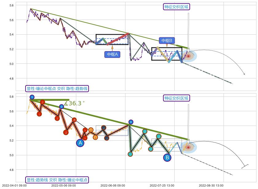 从2022-04-06 13:00至2022-05-12 09:00,共包含113个小时,阶段股价下跌-8.76%,阶段股价变动位移路程比: 1 : 5,下跌趋势角度: 50.4