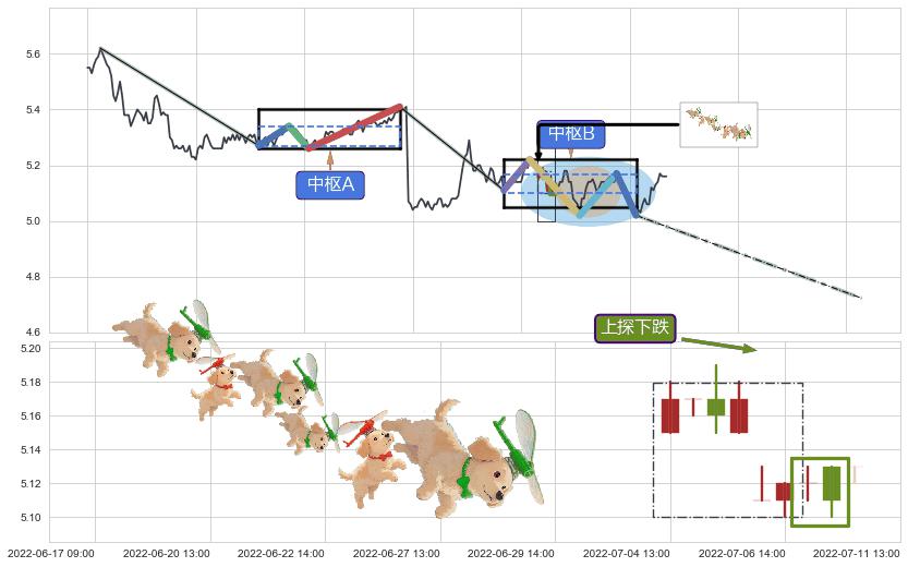 ➣ 【中枢B】:06-22:13-08-03:14,中枢由5笔构成,共62交易小时, ZG=5.17, ZD=5.11