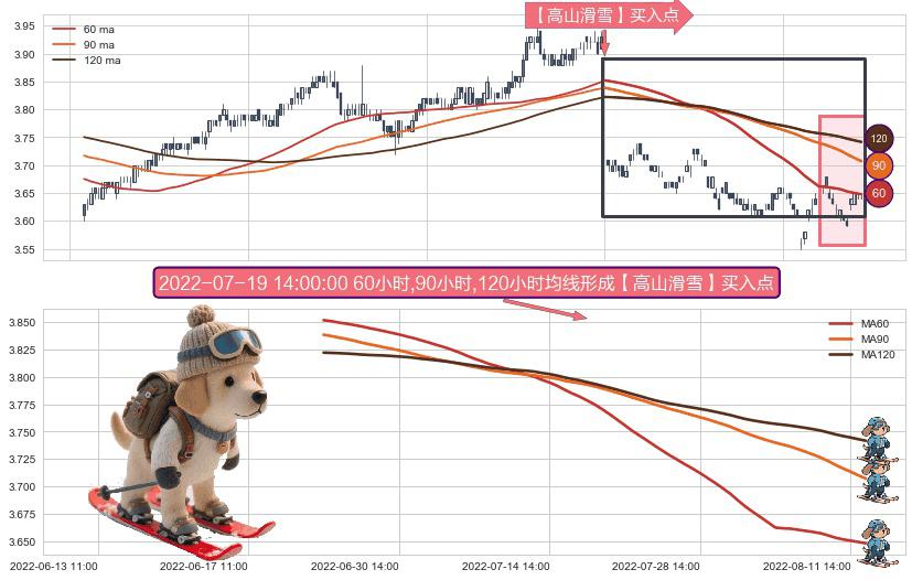 ⚀ 2022-06-23 14:00:00小时-2022-08-12 14:00:00小时显现 60小时-90小时-120小时均线 【高山滑雪】买入点 看多信号,后市看涨,买入