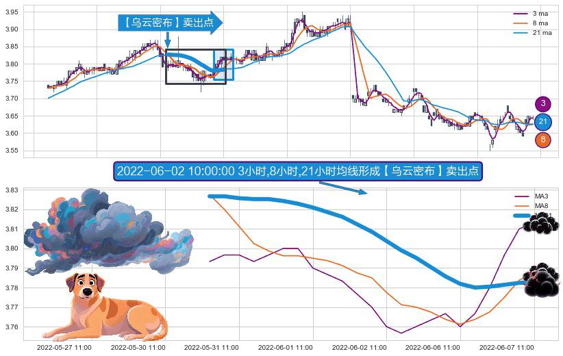 ⚀ 2022-05-31 09:00:00小时-2022-06-07 11:00:00小时显现 3小时-8小时-21小时均线 【乌云密布】卖出点 看空信号,后市看跌,卖出