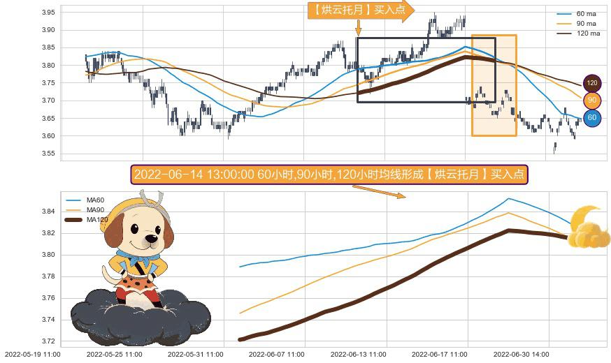 ⚀ 2022-06-01 10:00:00小时-2022-07-06 14:00:00小时显现 60小时-90小时-120小时均线 【烘云托月】买入点 看多信号,后市看涨,买入