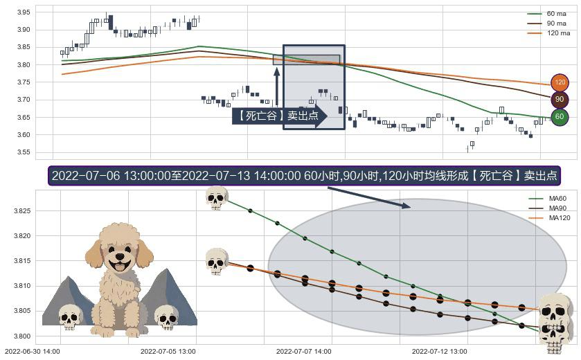 ⚀ 2022-07-06 14:00:00-小时至2022-07-13 14:00:00-小时显现 60小时-90小时-120小时均线 【死亡谷】卖出点 看空信号,后市看跌,卖出