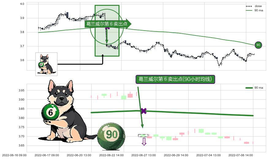 ⚀ 2022-06-24 13:00:00-小时显现 葛兰威尔均线 90小时均线 第⑥卖出点 走势反转见顶信号,后市看跌,卖出信号