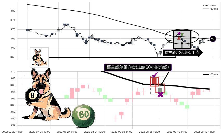 ⚀ 2022-08-08 13:00:00-小时显现 葛兰威尔均线 60小时均线 第⑧卖出点 下降趋势的中继信号,后市看跌,卖出信号