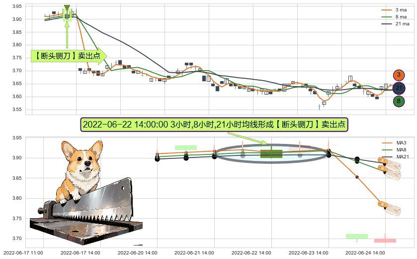 ⚀ 2022-06-22 14:00:00小时显现 3小时-8小时-21小时均线 【断头铡刀】卖出点 看空信号,后市看跌,卖出