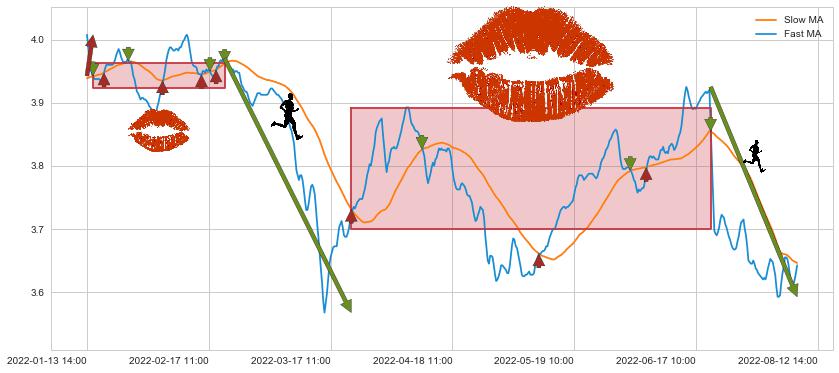 02-22 09:00至03-22 14:00 慢线与快线呈空头排列, 慢线与快线接触少,无缠绕
