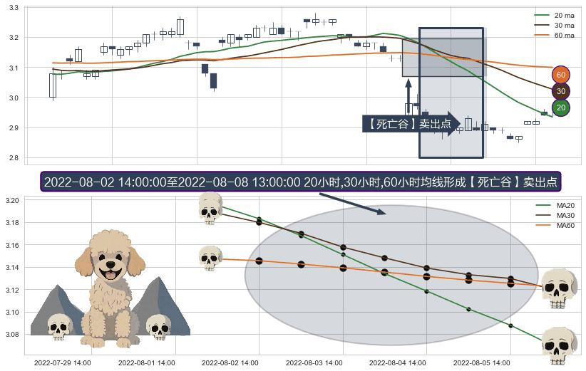 形态多维评估: ⚀ 2022-08-03 13:00:00-小时至2022-08-08 13:00:00-小时显现 20小时-30小时-60小时均线 【死亡谷】卖出点 看空信号,后市看跌,卖出