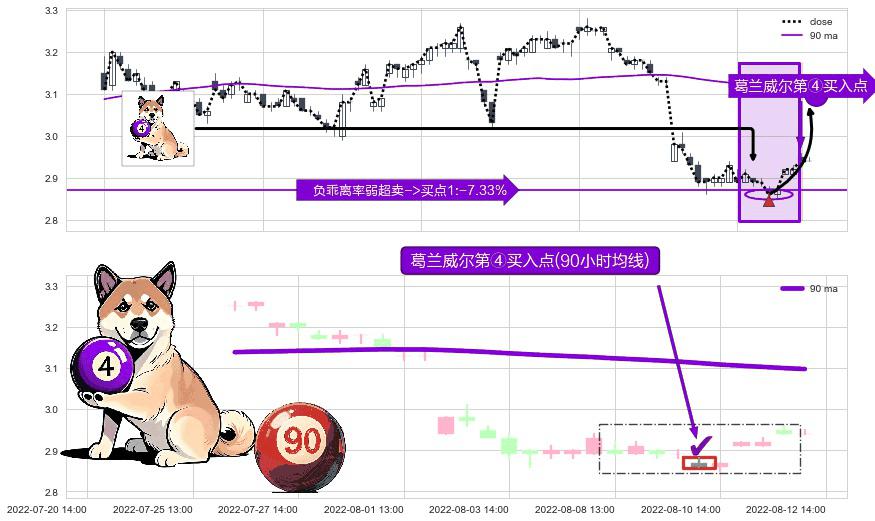 形态多维评估: ⚀ 2022-08-10 13:00:00-小时显现 葛兰威尔均线 90小时均线 第④买入点 下降趋势均值回复的短线反弹信号,后市看涨,买进信号