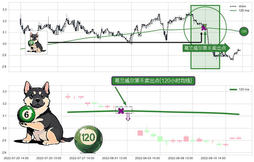 形态多维评估: ⚀ 2022-08-01 13:00:00-小时显现 葛兰威尔均线 120小时均线 第⑥卖出点 走势反转见顶信号,后市看跌,卖出信号