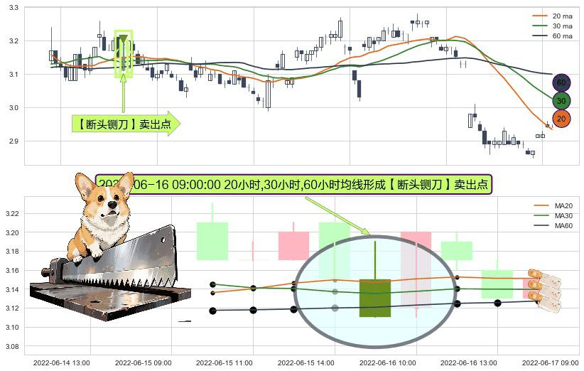 形态多维评估: ⚀ 2022-06-16 09:00:00小时显现 20小时-30小时-60小时均线 【断头铡刀】卖出点 看空信号,后市看跌,卖出