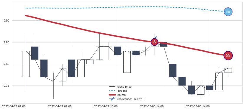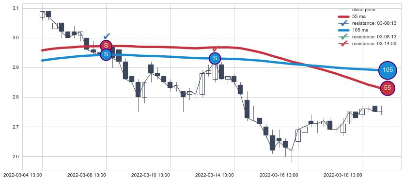 下跌趋势03-04 13:00-03-21 10:00,均线105, 55确认关键阻力2处
