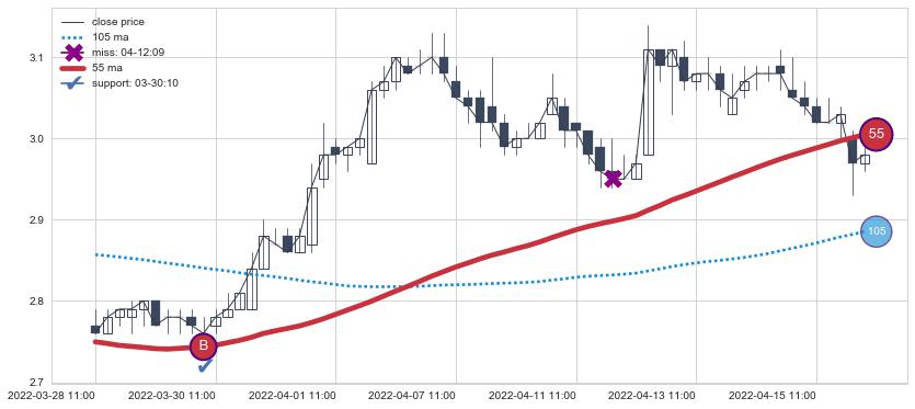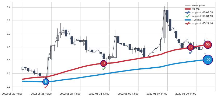上涨趋势05-23 10:00-06-10 09:00,均线105, 55确认关键支撑3处