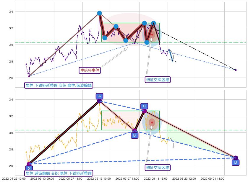 从2022-07-25 13:00至2022-08-12 14:00,共包含30个小时,阶段股价下跌-9.82%,阶段股价变动位移路程比: 1 : 2,2022-08-02 13:00向↘︎形成缺口,跳空下跌-4.79%˚