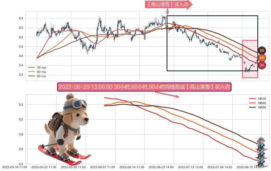 ⚀ 2022-06-02 13:00:00小时-2022-08-12 14:00:00小时显现 30小时-60小时-90小时均线 【高山滑雪】买入点 看多信号,后市看涨,买入