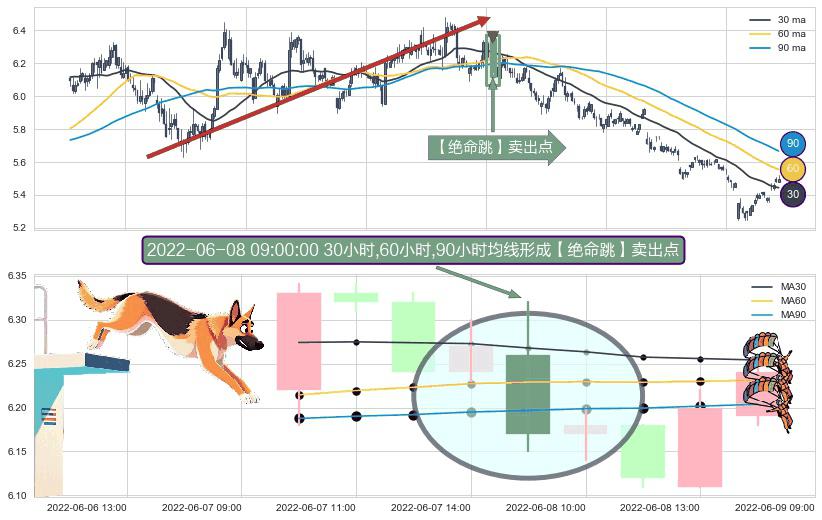 ⚀ 2022-06-08 09:00:00小时显现 30小时-60小时-90小时均线 【绝命跳】卖出点 看空信号,后市看跌,卖出