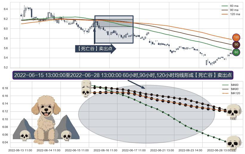⚀ 2022-06-15 14:00:00-小时至2022-06-28 13:00:00-小时显现 60小时-90小时-120小时均线 【死亡谷】卖出点 看空信号,后市看跌,卖出