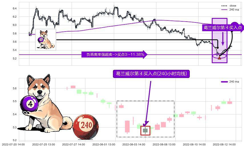 ⚀ 2022-08-03 14:00:00-小时显现 葛兰威尔均线 240小时均线 第④买入点 下降趋势均值回复的短线反弹信号,后市看涨,买进信号